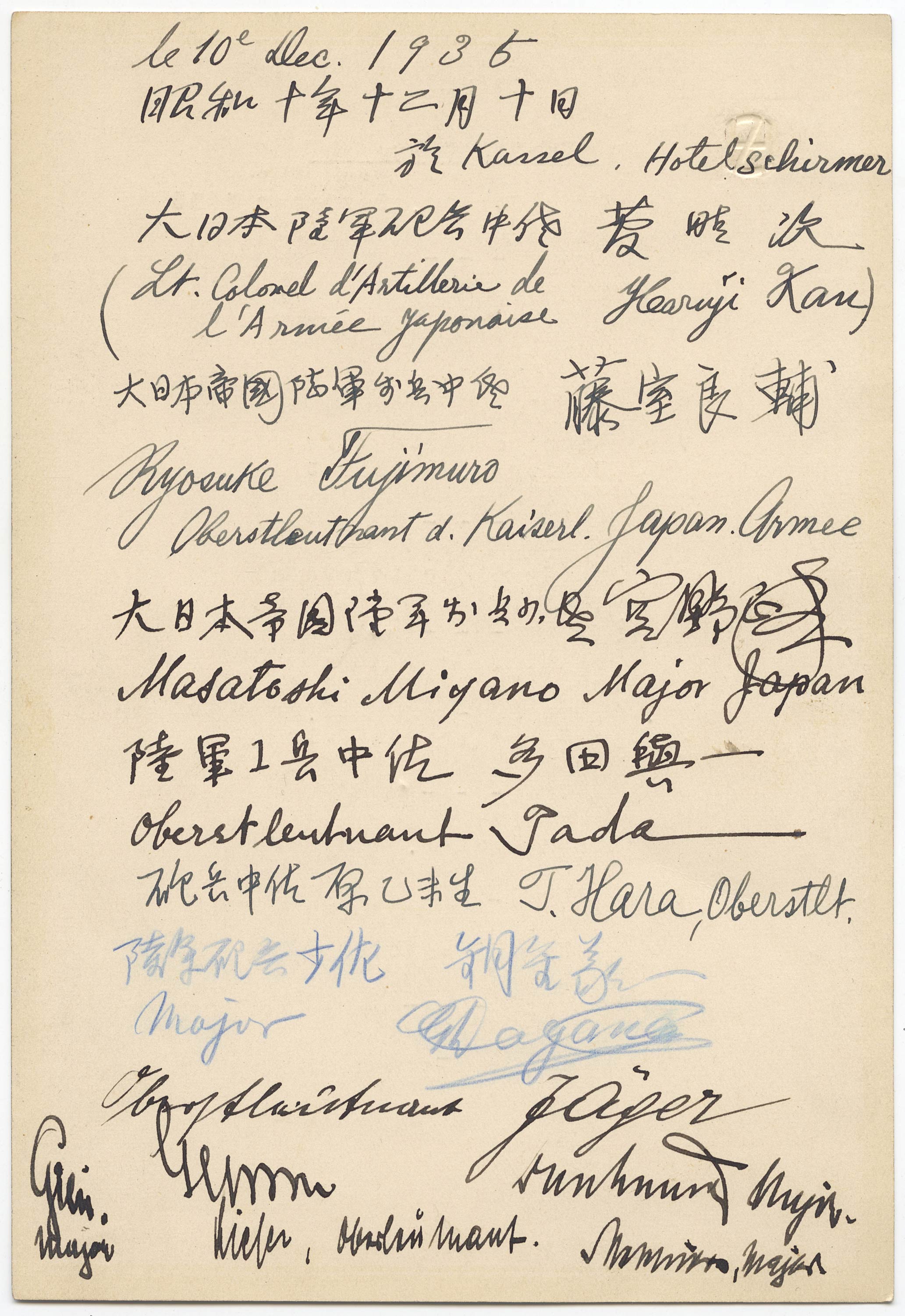 Ein Treffen zwischen deutschen und japanischen Offizieren Kassel, Hotel Schirmer, 10. Dezember 1935 le 10e Dec. 1935 / den 10. Dezember 1935 大日本帝国陸軍中佐 菅晴次 大日本帝国陸軍中佐 藤室良輔 大日本???????? 宮野正年 陸軍1号中佐 多田與一 Tada Yoichi ?????????????中佐 T. Hara, Oberstleutnant ??????????????? ???? Major Nagano Oberstleutnant Jäger |