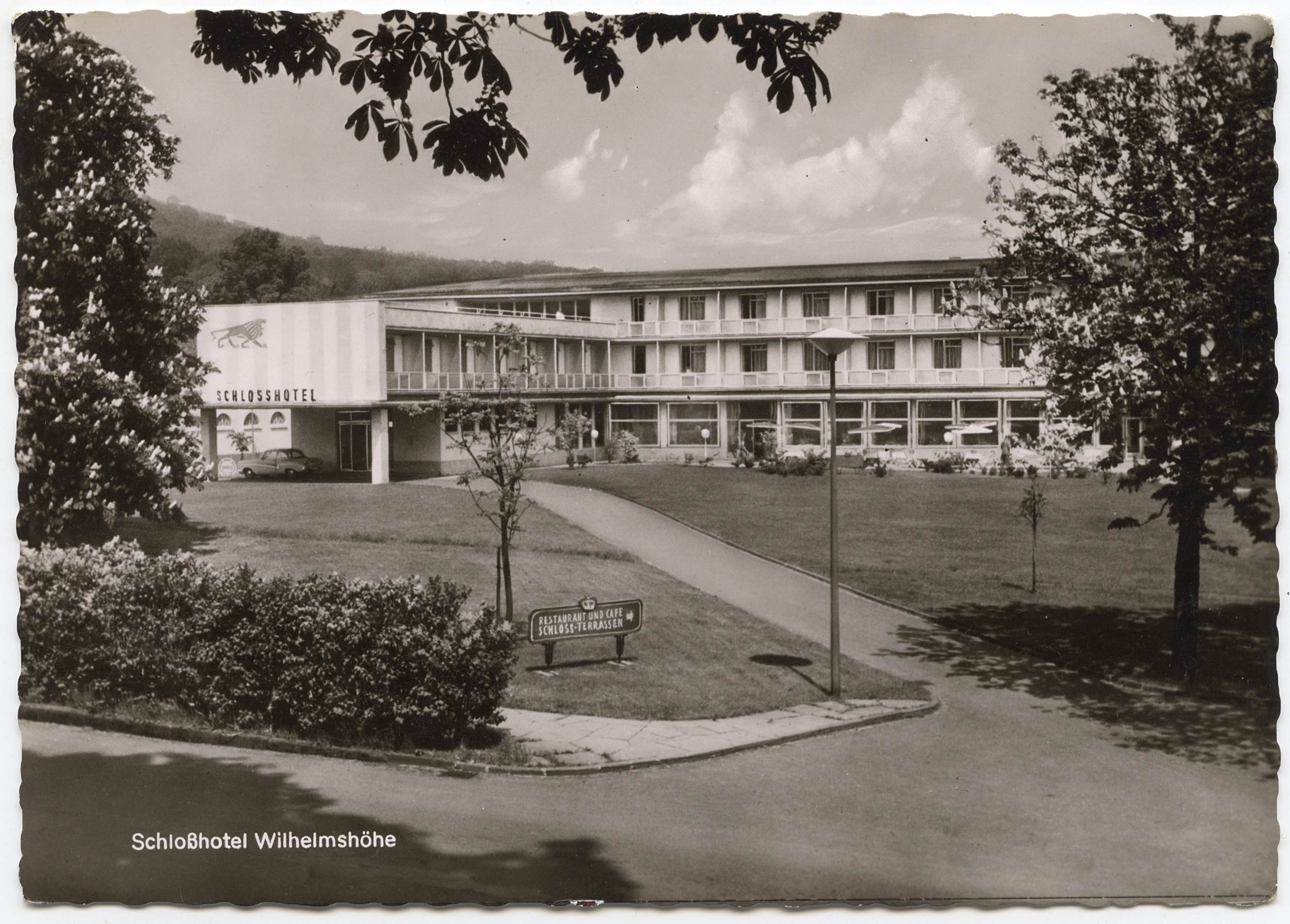 Es gibt ein Gästebuch (20 Seiten, 10 MB) des Schloßhotels, Zeitraum: 10. Oktober 1933 bis 30. Oktober 1942. Auf der ersten Seite u.a. eigenhändige Einträge (→) von »Philipp Prinz von Hessen«, »Ernst Ludwig Großherzog von Hessen u bei Rhein«, »Eleonore Grossherzogin v. Hessen u. bei Rhein«, »Cecilia Erbgrossherzogin von Hessen, Prinzession von Griechenland und Dänemark«, »Georg Donatus Erbgroßherzog v. Hessen u. bei Rhein«, »Ludwig Prinz von Hessen u. b. Rhein«, danach u.a. allerhand Nazi-Größen. Das Gästebuch enthält zahlreiche Fotos, auch solche des zerstörten Hauses.*15 1945 brannte das Schloßhotel bis auf die Grundmauern aus. Siehe das Foto in der linken Spalte. * * * Um 20 Meter in der Bauflucht zurückversetzt, wurde 1955 ein Hotel-Neubau (Schloßpark Nr. 8) eröffnet, der 60m weiter hinten steht als das alte Hotel; Architekten: Paul Bode und Werner Noell. Der erste Hotelier des eleganten Hauses war Hans Arnold. Im Mulang-Archiv vorhanden: * * * Etwa 2010 kam das Haus in neue Hände (hier ein Link (→) auf die Website), wurde renoviert und wird hiermit warm empfohlen – die Aussicht aus dem Dach-Glaskasten-Zimmer auf Schloß und Löwenburg, auf den Herkules und über das Domänenland auf die Stadt ist spektakulär (auf die Wörter klicken für Fotos von Friedrich Forssman und Cornelia Feyll). |