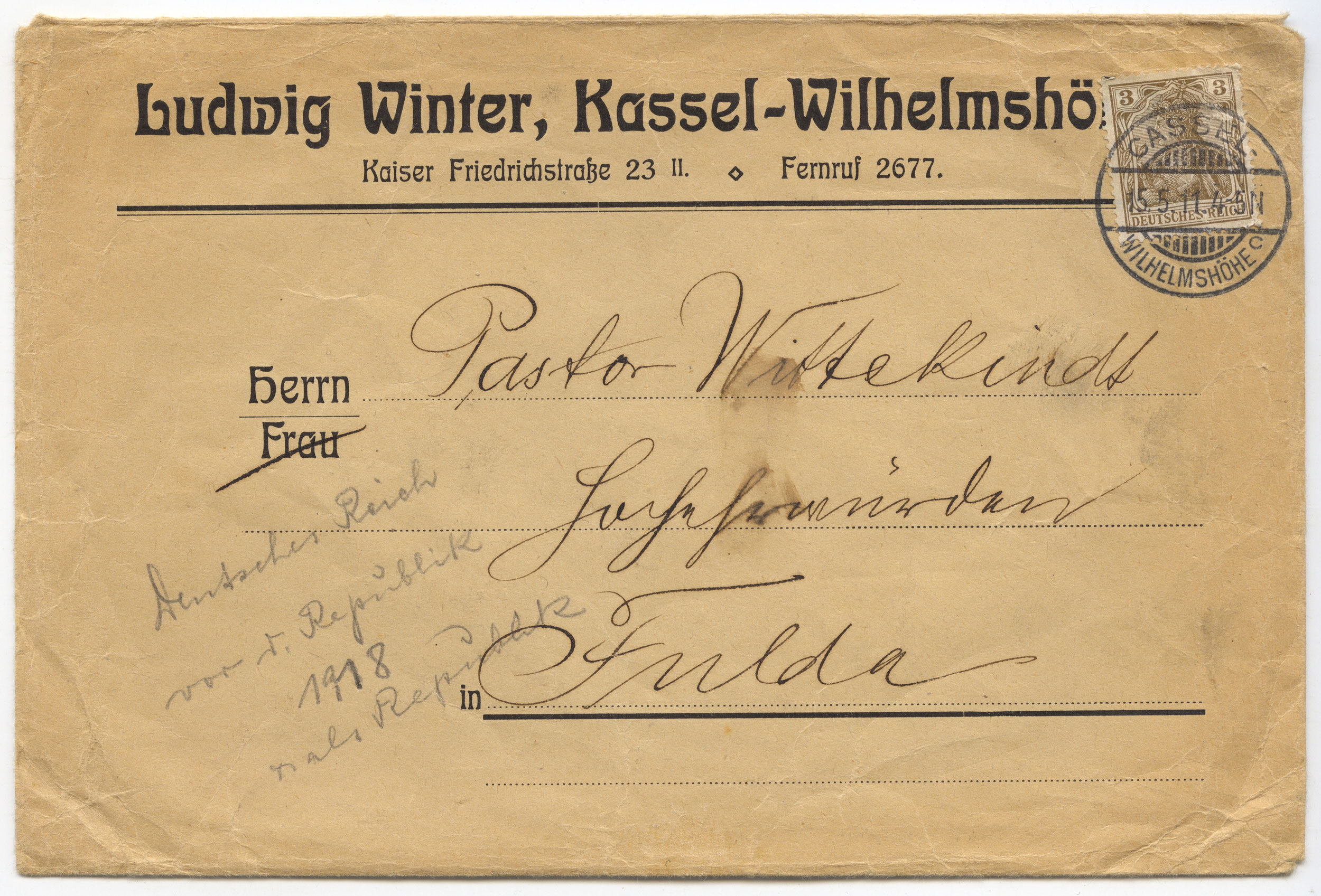 1911 gestempelt: Briefumschlag der Firma »Ludwig Winter, Kassel-Wilhelmshöhe – Kaiser Friedrichstrasse 23 II.«*MA