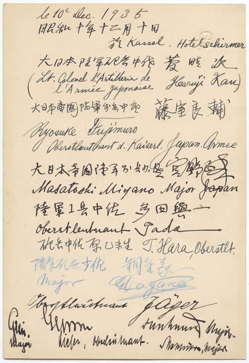 Ein Treffen zwischen deutschen und japanischen Offizieren Kassel, Hotel Schirmer, 10. Dezember 1935 le 10e Dec. 1935 / den 10. Dezember 1935 大日本帝国陸軍中佐 菅晴次 大日本帝国陸軍中佐 藤室良輔 大日本???????? 宮野正年 陸軍1号中佐 多田與一 Tada Yoichi ?????????????中佐 T. Hara, Oberstleutnant ??????????????? ???? Major Nagano Oberstleutnant Jäger |