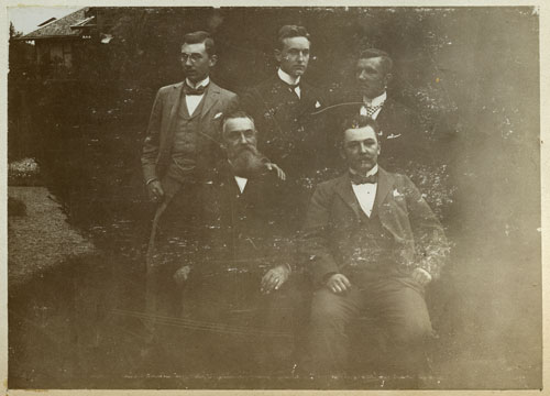 13.4 Heinrich Schmidtmann und seine vier Söhne (v.l.:) Karl (*4.3.1878), Fritz (*16.10.1879), Hermann (*20.11.1875); rechts vom Vater sitzend: Christian (»Christel«, *2.3.1872). Aufnahme im Garten der Burgfeldstraße 8, links im Hintergrund der Schmidtmann-Bau Burgfeldstraße 7. |